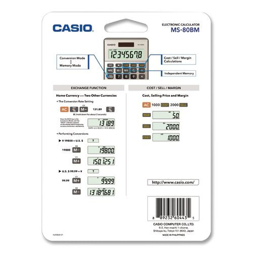 The Casio® MS-80B eight-digit desktop calculator meets a variety of business needs. Keep this calculator at your desk for whenever you need answers to math problems. Streamline financial calculations with tax calculation, currency conversion and profit margin functions. Can be operated from solar or battery power, so you can use the calculator both day and night. Three-key memory keeps often used figures accessible for faster calculations, Square root, rounding switch, sign change, grand total, and percent functions help you solve a variety of mathematical problems. Key rollover feature makes sure nothing is lost during high-speed input. Keys are made of plastic.