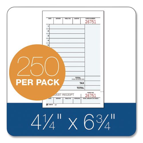 A service-industry standard, Adams® Multi-Part Guest Checks are ideal for capturing your guests' food and beverage orders. Consecutively numbered, each check's front features plenty of space to capture the food-menu selections as well as the server, table and number-of-guests details, while the back of the original allows you to capture your guests' beverage orders. Carbonless, multipart format and a perforated stub on the original allows you provide a copy to your kitchen for food orders, a receipt-stub to your guest and keep the original for yourself. Original is printed on bond-weight paper; copies are printed on heavyweight tag.