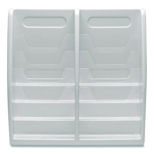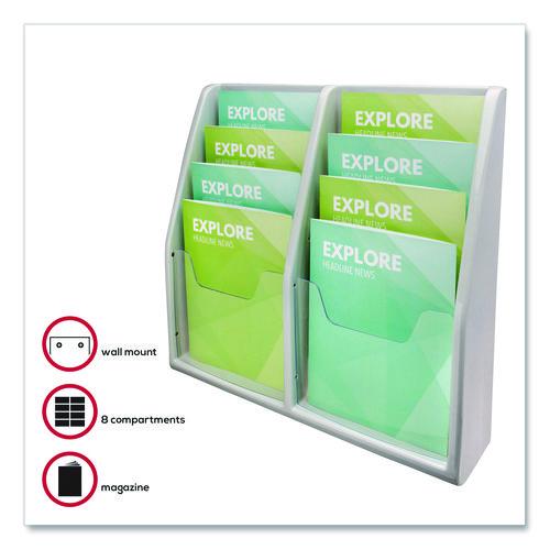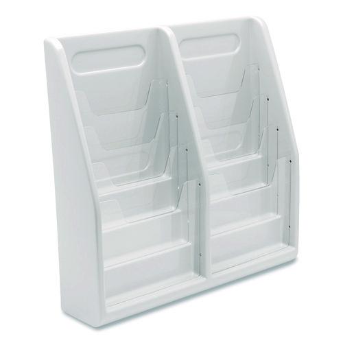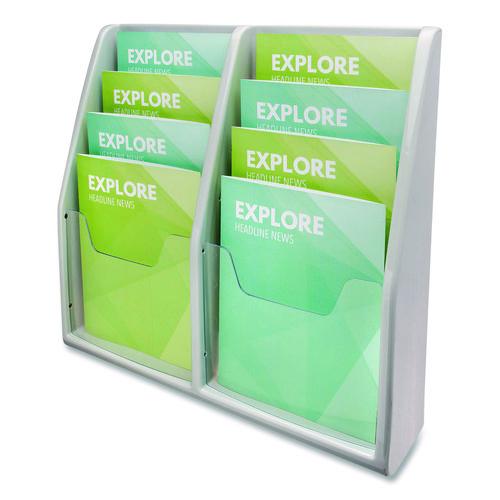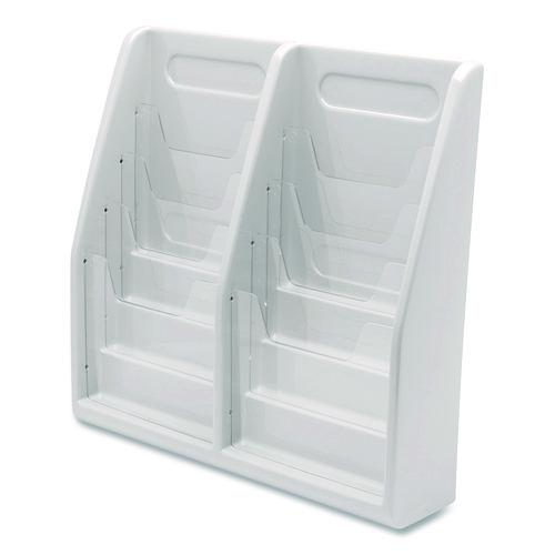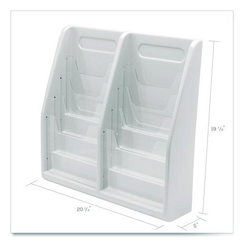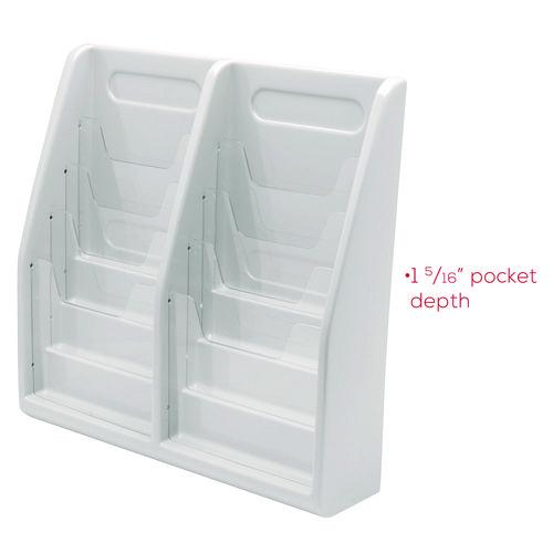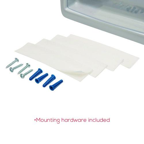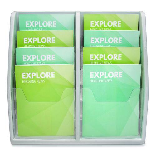 Tiered literature display with rounded edges can be used individually or in groups to create a custom display. The lightweight design is easy to mount on a wall or can also be displayed on a countertop. Clear front pockets allow for easy viewing of literature. Mounting hardware and two sided tape pads are included.Package Includes: (4) Sets of Tape Pads; (4) Screws/AnchorsNote: This is a non-returnable item.
