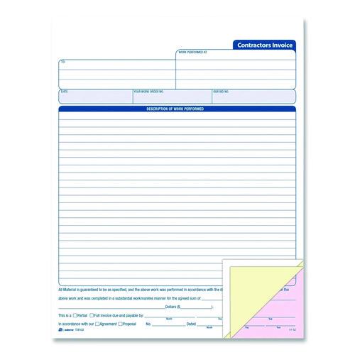Streamline billing activities with Adams® Multipart Contractor Invoice Forms. Flexible formatting features a large description area to help you leave precise details about each aspect of the job performed. Additional areas accommodate customer information, work location, order number, proposal/bid number, payment instructions and other administrative aspects. Multipart, carbonless design allows you provide a copy to your customer while keeping clean copies for your records. Each form set also features open space at top for your business's logo or name stamp.