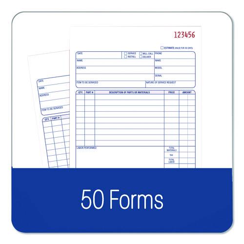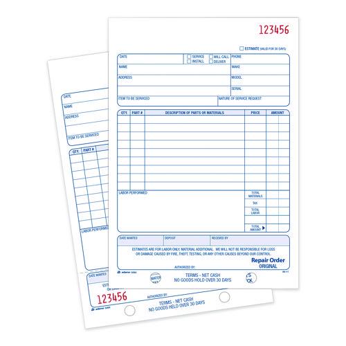 Ideal for a wide variety of repair orders and associated estimates, Adams® Multipart Repair Order Pads provide large areas for itemized parts/materials and labor cost descriptions as well as dedicated areas for the important administrative aspects. Carbonless, multipart design allows you provide a copy to your customer while keeping clean copies for your records. For your customer's convenience, the last copy of each set also features a perforated claim check; and for your convenience, the pad's wraparound cover allows you to place the front cover between sets as you fill out a form, minimizing the potential for write-through.