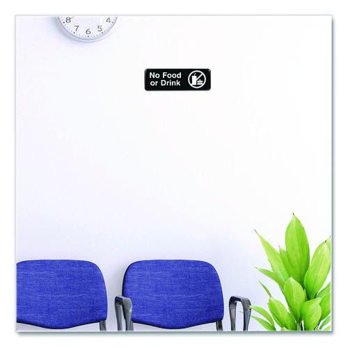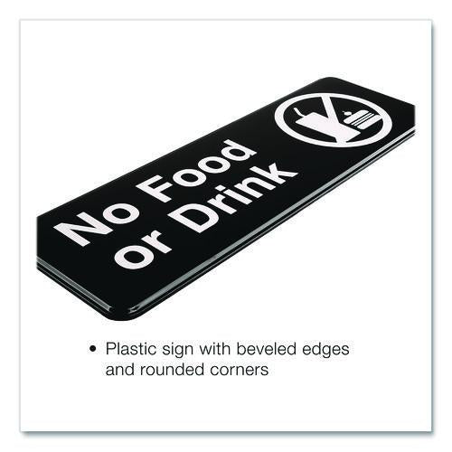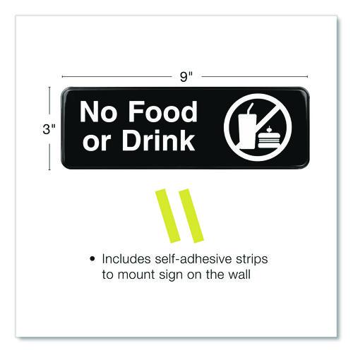 Great for business establishments to remind employees, customers and visitors that food and drinks are not allowed inside the premises. Plastic material is durable, withstands most environments and will not fade in extreme temperatures. Easy to install with the included adhesive strips.