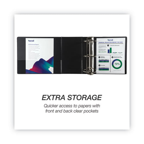 Besides storing documents, a binder is also an ever-present accomplice of office goers, students, and homeowners looking to be more productive and organized. These durable binders feature a clear overlay on the front, back, and spine giving full control and flexibility over customization of presentations, organizational projects, office reports, class projects, and more. Order multiple binders to create a custom reference system for weekly or monthly office reports, multiple classes at school, or other unique personal or professional projects. Binders are also non-stick, which prevents transfer of ink or lifting copy when materials are inserted in the cover or placed inside. This makes it easy to reuse and update the covers and spines as often as you'd like. Plastic is tightly sealed over rigid chipboard. Rings are mounted on the back lid which allows pages to lay flat and prevent wear and tear of the documents. Such a construction also adds to a sleek, clean appearance with no-rivet spine. Also includes two clear inside horizontal pockets for additional storage and organization of loose documents and non-punched papers. Each pocket provides enough space to hold notes, photos, business cards, or full-size pages that will be punched later. Perfect for school, office or even managing your personal documents at home.