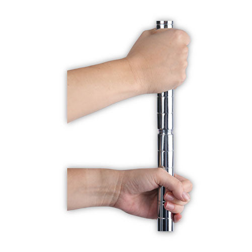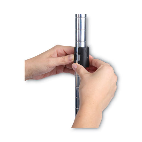 Ideal storage solution for commercial or business use. Snap-together design assembles in minutes. Strong welded wire construction provides exceptional strength and stability. Open design allows air circulation and reduces dust build-up. Includes six shelves, posts, shelf clips and leveling glides. Up to 600 lbs. per shelf (evenly distributed) when used without casters. Casters (2 locking) provide mobility and can be omitted to increase weight capacity of unit.Package Includes: (6) Shelves; (4) Posts; Leveling Glides; Shelf Clips