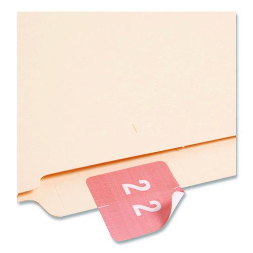 Keeping files organized couldn't be easier with these pre-printed numeric labels. Featuring a color-coded wraparound design, almost anyone can read them at a glance, from either the front or the back. Clear lamination not only prevents the smudging that's typical with regular handling, but it also prevents cracking along the center fold line to provide added durability. The available color selection is designed specifically to be compatible with end tab filing systems, where the bar-style format is the norm. Convenient dispensing box makes application a snap.