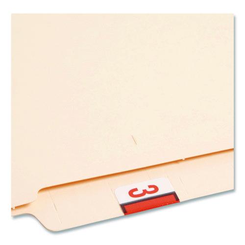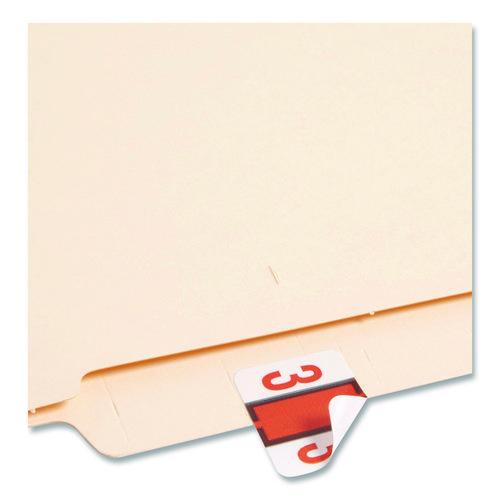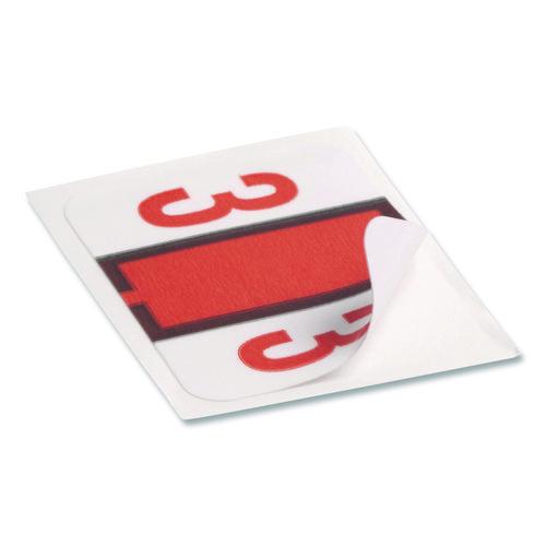 Keeping files organized couldn't be easier with these pre-printed numeric labels. Featuring a color-coded wraparound design, almost anyone can read them at a glance, from either the front or the back. Clear lamination not only prevents the smudging that's typical with regular handling, but it also prevents cracking along the center fold line to provide added durability. The available color selection is designed specifically to be compatible with end tab filing systems, where the bar-style format is the norm. Convenient dispensing box makes application a snap.