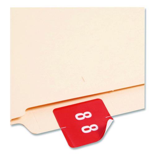 Keeping files organized couldn't be easier with these pre-printed numeric labels. Featuring a color-coded wraparound design, almost anyone can read them at a glance, from either the front or the back. Clear lamination not only prevents the smudging that's typical with regular handling, but it also prevents cracking along the center fold line to provide added durability. The available color selection is designed specifically to be compatible with end tab filing systems, where the bar-style format is the norm. Convenient dispensing box makes application a snap.