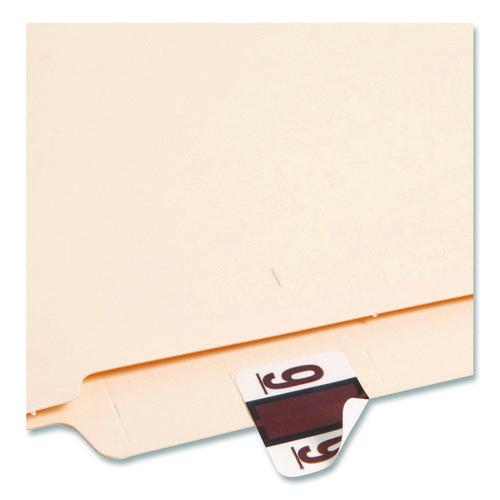 Keeping files organized couldn't be easier with these pre-printed numeric labels. Featuring a color-coded wraparound design, almost anyone can read them at a glance, from either the front or the back. Clear lamination not only prevents the smudging that's typical with regular handling, but it also prevents cracking along the center fold line to provide added durability. The available color selection is designed specifically to be compatible with end tab filing systems, where the bar-style format is the norm. Convenient dispensing box makes application a snap.