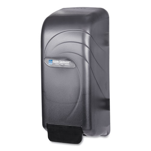 Versatile dispenser may be used in conjunction with three separate delivery systems: bulk liquids and gels, bag-in-box cartridges or bag refills. Included 800-mL bottle accommodates bulk liquid soaps and gel sanitizers. Impact-resistant plastic shell easily mounts to walls. Security lock utilizes a standard San Jamar® waffle key.