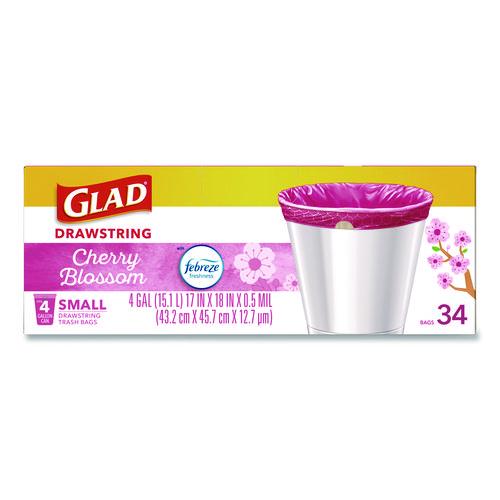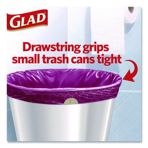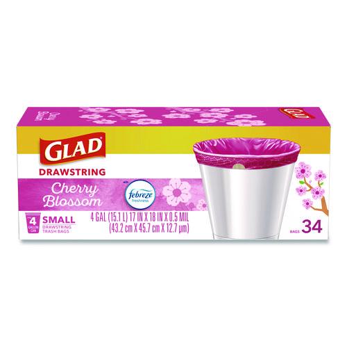 Glad® OdorShield® Drawstring Small Trash Bags with Febreze provide strength plus odor control, to keep your home smelling fresh. These small garbage bags are made with OdorShield® technology and Febreze freshness to provide continuous odor neutralization, based on time lapse technical evaluation. Featuring printed design around the internal ring of the bag, these trash bags add an aesthetic touch to any room when it is folded around the edge of the can. These scented trash bags fit small size trash cans and are great for in the bathroom, in home office, bedroom and laundry room.