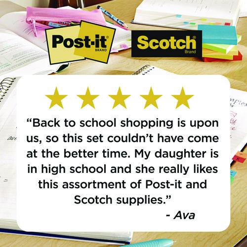 Make sure you have the basics close at hand to crush any work or personal organization challenge that might come your way. This bundle comes with Post-it® Super Sticky Notes, Scotch® Brand Tape, Post-it® Flags and Scotch Precision Scissors for a complete kit to write down great ideas, find information fast and prepare to handle fixes on-the-go. The perfect essentials pack. Great gift of back-to-school supplies for teachers. Post-it® Super Sticky Notes have two times the sticking power to make sure notes sticks. Scotch® Brand Tape is ideal to have on hand for creating poster board projects, and labeling on surfaces like plastic, cardboard and metal. Includes one pack of four Post-it® Super Sticky Note pads 3" x 3", one pack of three Post-it® Super Sticky Note pads, 4" x 6" lined, in the Supernova Neon colors, pack of 60 Post-it® Flags, assorted colors, 0.94" wide, one roll Scotch® Magic Tape, 0.75" x 650", one roll Scotch® Super-Hold Tape, 0.75" x 650" and one Scotch 8" Multi-Purpose Scissors.Package Includes: (4) 3" x 3" Post-it® Super Sticky Note Pads; (3) 4" x 6" Lined Post-it® Super Sticky Note Pads in Supernova Neon Colors; (1) 60/Pack 0.94" Wide Post-it® Flags in Assorted Colors; (1) 0.75" x 650" Roll Scotch® Magic Tape; (1) 0.75" x 650" Roll Scotch® Super-Hold Tape; (1) Scotch 8" Multi-Purpose Scissors
