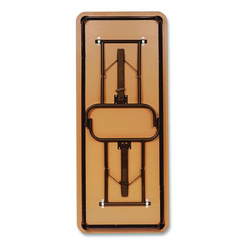 Wear-resistant, 3/4" thick melamine top with vinyl T-mold edge. Melamine sealed underside helps prevent moisture absorption. Full perimeter steel skirt support with plastic corners to protect surface when stacking. 1" diameter, heavy gauge steel legs with heavy-duty foot caps to protect floors. Heavy-duty leg supports and gravity leg lock for secure set-up. Folds to 2-1/2" for compact storage.