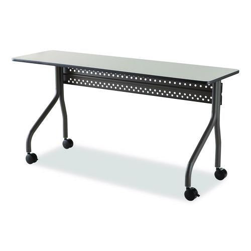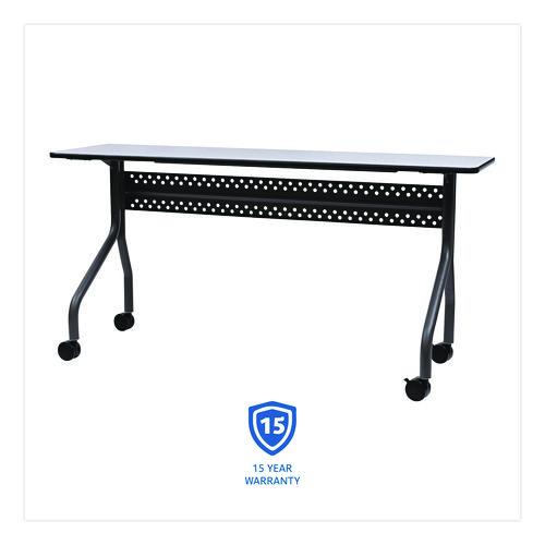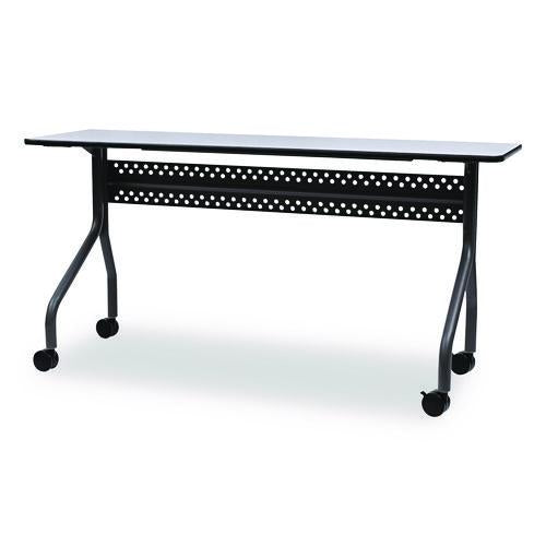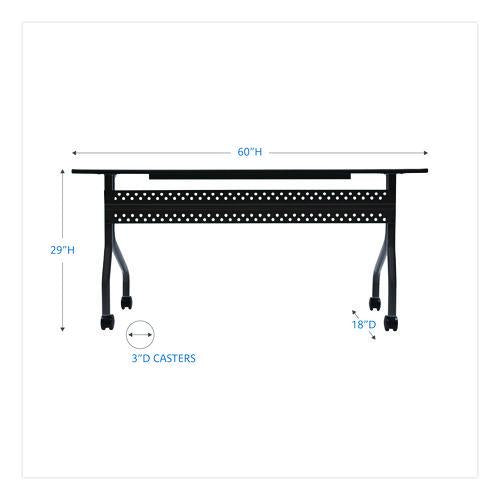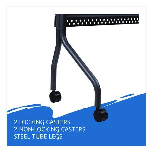 Functional, durable mobile training tables easily reconfigure to improve meeting productivity. Wear-resistant melamine top resists moisture and hot/cold temperatures. Includes perforated steel modesty panel. Strong, 1-1/2" offset dual legs for maximum legroom. Two locking casters and two non-locking casters for improved navigation over transoms.Package Includes: Table Top; Base; Modesty Panel; Casters