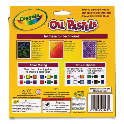 Enjoy the smooth, creamy laydown of Crayola® Oil Pastels. Their vivid, opaque colors blend wonderfully, opening up a wide world of true color mixing, tinting and shading; and as they're designed specifically for younger artists, they're also stronger, more durable and not as soft or as messy as artist-grade oil pastels. Their no-roll hexagonal shape is also more convenient for young artists, while their tapered points make it easy for children to get started right away.