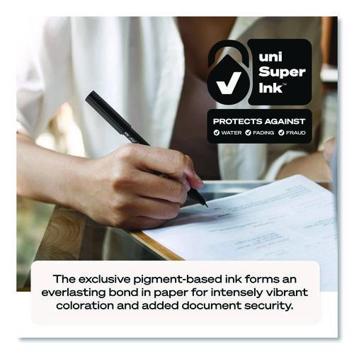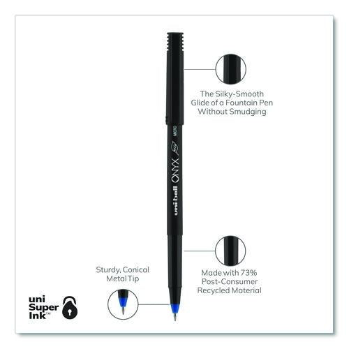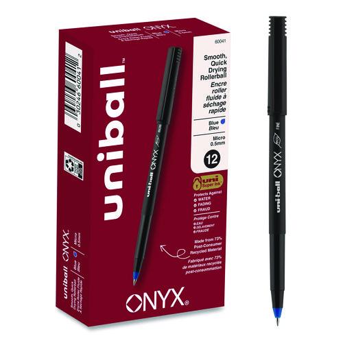 Stock your office, home or classroom with Onyx Rollerball Stick Pens from uni-ball featuring strong, long lasting tip sizes. This rollerball pen delivers the silky-smooth glide of a fountain pen without smudging for effortless writing. ONYX pens produce crisp and precise lines for intricate writing, making it easy to create super fine details in your drawings and diagrams. Capped roller pens are useful for a variety of tasks from note taking to signing checks and legal documents to uniquely embellishing fun and creative writing projects. Innovative uni Super Ink technology forms a strong bond with the paper, protecting from water, fading and fraud. A great economic and environmentally-conscious choice as this super sleek micro point roller pen is made from post-consumer recycled material.