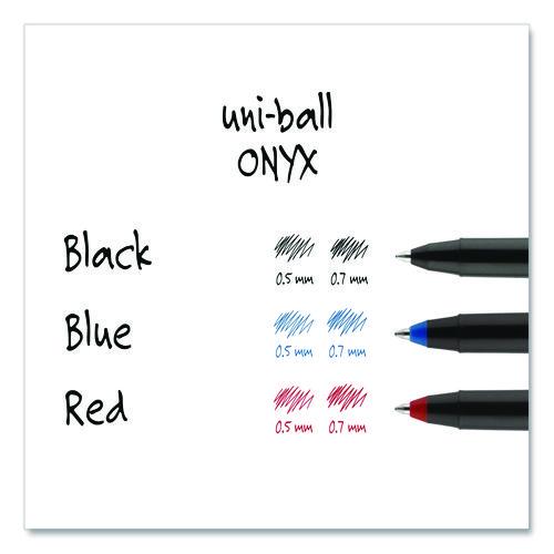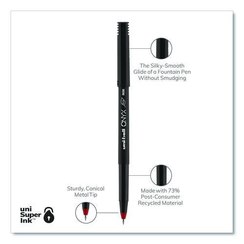 Stock your office, home or classroom with Onyx Rollerball Stick Pens from uni-ball featuring strong, long lasting tip sizes. This rollerball pen delivers the silky-smooth glide of a fountain pen without smudging for effortless writing. ONYX pens produce crisp and precise lines for intricate writing, making it easy to create super fine details in your drawings and diagrams. Capped roller pens are useful for a variety of tasks from note taking to signing checks and legal documents to uniquely embellishing fun and creative writing projects. Innovative uni Super Ink technology forms a strong bond with the paper, protecting from water, fading and fraud. A great economic and environmentally-conscious choice as this super sleek micro point roller pen is made from post-consumer recycled material.