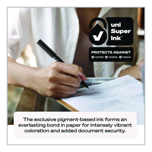Stock your office, home or classroom with Onyx Rollerball Stick Pens from uni-ball featuring strong, long lasting tip sizes. This rollerball pen delivers the silky-smooth glide of a fountain pen without smudging for effortless writing. ONYX pens produce crisp and precise lines for intricate writing, making it easy to create super fine details in your drawings and diagrams. Capped roller pens are useful for a variety of tasks from note taking to signing checks and legal documents to uniquely embellishing fun and creative writing projects. Innovative uni Super Ink technology forms a strong bond with the paper, protecting from water, fading and fraud. A great economic and environmentally-conscious choice as this super sleek micro point roller pen is made from post-consumer recycled material.