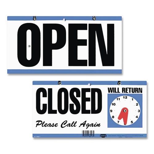 Reversible sign is easy to switch to let people when you are open for business. Closed side features an adjustable clock so you can indicate lunch/break closure times. Weather-resistant plastic with chain for hanging.