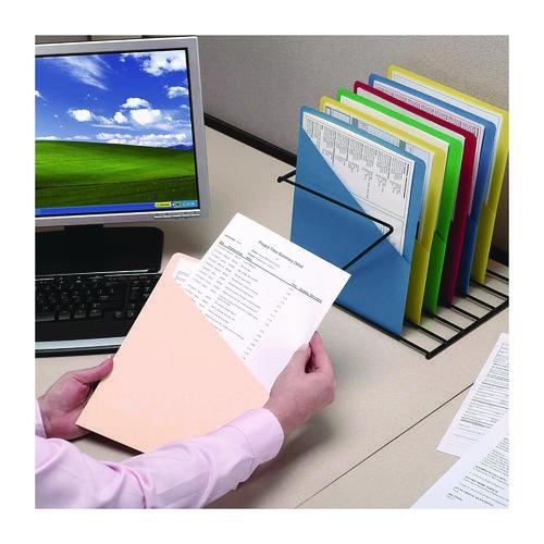 Keep documents safe, organized and within reach. Smead's Organized Up Notes Slash File Jackets are designed to help you keep files organized. These file jackets have an angled front for viewing documents while keeping papers tidy. Sealed on the sides and bottom, these pockets keep your papers secure and in order. Die cut to hold business cards, these file jackets are excellent for real estate, presentations and sales pitches. A simple change can boost your productivity and improve your organization. Contain post-consumer recycled material.