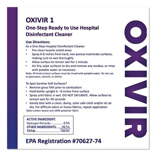 Next generation, ready-to-use disinfectant cleaner, based on proprietary hydrogen peroxide (AHP) technology, delivers fast, effective virucide, bactericide, tuberculocide, fungicide and non-food contact sanitizer performance. Kills MRSA and Norovirus. Disinfects in one minute or less, making it the shortest contact time in the Diversey portfolio of disinfectants and disinfecting wipes: 30 seconds as a virucide (one minute for canine parvovirus); one minute as a bactericide, tuberculocide or fungicide; 10 seconds as a non-food-contact sanitizer; and 30 seconds as a soft-surface sanitizer. Colorless disinfectant features a nonintrusive, characteristic scent.