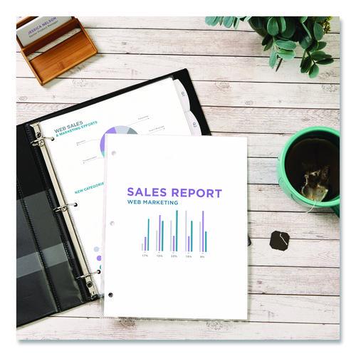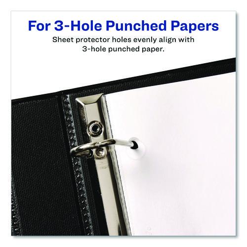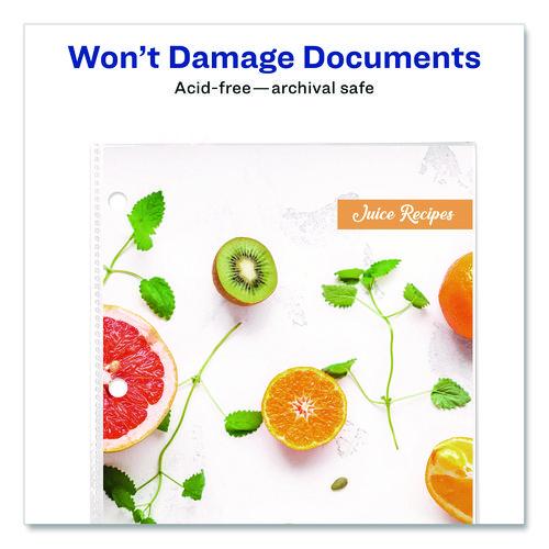 Protect your papers without obstructing your tab dividers. These Page Size Sheet Protectors offer sturdy protection of your three-hole punched pages without an extended binding edge that makes tabs hard to find. Durable material withstands the rigors of use in a three-ring binder while allowing you to view your pages with diamond clarity. The acid-free and archival-safe material keeps your pages in top condition and won't lift print from papers. With these sheet protectors, your pages will have the lasting protection they need.