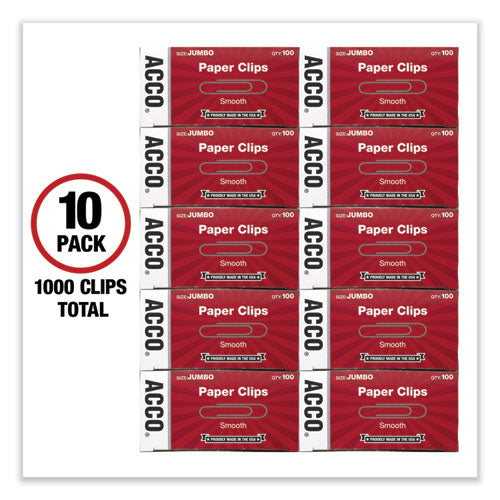 Paper Clips, Jumbo, Smooth, Silver, 100 Clips/Box, 10 Boxes/Pack