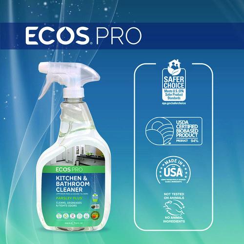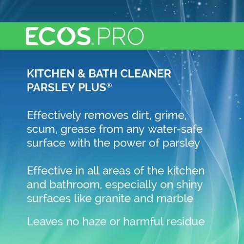 The ECOS PRO Parsley Plus all-purpose kitchen and bathroom cleaner and degreaser washes and fights odors with the natural power of parsley. This pH-balanced formula removes dirt, grease, grime, and scum from water-safe surfaces. Cleans and shines all areas of the kitchen and bathroom; works exceptionally well on granite and marble, leaving no haze or residue even on high-shine stone surfaces. Made using sustainable, plant-powered ingredients. Made without dyes; gray water and septic safe. Features a pleasant parsley scent. Not tested on animals. Manufactured in a facility that is LEED Zero Carbon, LEED Zero Waste, and LEED Zero Energy Certified.Note: This is a non-returnable item.