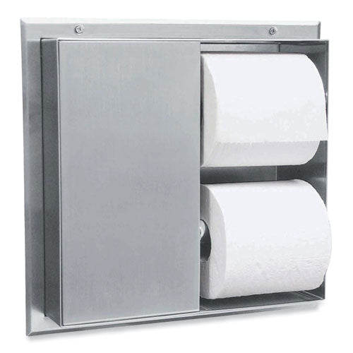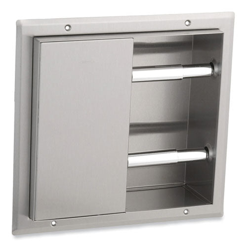 Satin-finish stainless steel dispenser mounts centered through toilet partitions, 0.5" to 2" thick; used from both sides. Holds four standard core toilet tissue rolls up to 5.13" diameter; two for each side. Chrome-plated plastic spindles with heavy-duty internal springs. Rough Partition Opening: 11.5" w x 10.88" h. Type-304, 22-gauge stainless steel.Note: This is a non-returnable item.
