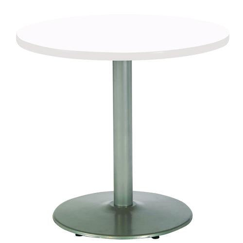 Contemporary and comfortable breakroom/cafeteria furniture. Table and 4 chair set. Table has a 1.25" thick high-pressure laminate top that's durable and easy to clean. The top has an attractive edge that won't crack or peel. The solid cast iron round base has leveling glides to prevent the table from wobbling on uneven floors. The base is made of durable cast iron with a 3" diameter column and is made of 16-gauge steel. The top and base are all shipped in one box. Easy to assemble. The chair has an "easy to clean" polypropylene seat and back. The ergonomic perforated back allows for enhanced circulation, while the radius conforms to your back for maximum comfort. The chair offers a contoured extra wide seat pan and a 400 lb. weight capacity to provide comfort and accommodate all sizes. The oval frame is made of 15-gauge steel with silver powder-coat. The 2300 is one of most complete stack chairs on the market. It's just plain.... KOOL. Tables shipped unassembled. Chairs shipped assembled.Package Includes: Designer White 36" Round Laminate Table Top; 29" Tall Silver Finished Cast Iron Pedestal Table Base; (4) Navy Polypropylene 17.5" Seat Height ChairsNote: This is a non-returnable item.