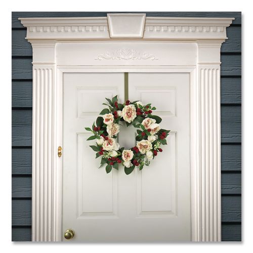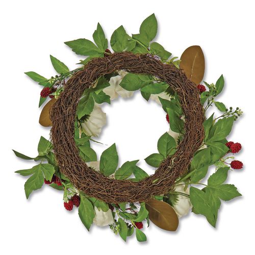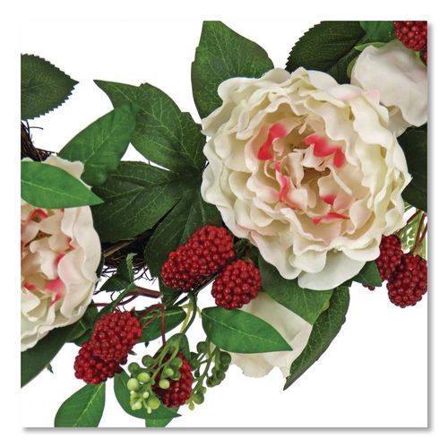 This wreath features a swirl of broad leaf greenery bursting with cream-colored peony flower blooms. It is trimmed with groups of bright red raspberries as well as smaller berry clusters that add complementing colors. A naturally appealing thick woven branch ring base provides sturdy support and enhances the wreath's rustic charm, making it a beautiful addition to any door or wall.Note: This is a non-returnable item.