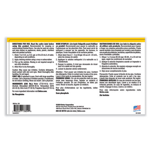 This mild cleaner will emulsify and suspend dirt and grime from most surfaces. Can be used as a spray, or applied with an autoscrubbers or a mop bucket and pail. The neutral pH won't attack, haze, or dull floor gloss. Dissolves and removes a wide variety of soils, leaving floors film free. Rinsing is not required except in very dirty situations.