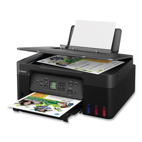 Designed for home and home offices, the Canon PIXMA G3270 MegaTank all-in-one color inkjet printer delivers high-quality, low-cost printing and outstanding wireless connectivity in a compact size. The printer is easy to set up and maintain and offers great media versatility to print on a variety of media types and sizes, including photo paper, envelopes, banners and more. Print both documents and photos on a variety of paper types using a hybrid ink system with pigment black for sharp black text and dye-based colors for vivid borderless photos up to 8.5" x 11". Produce crisp, colorful documents quickly and cost-effectively with fast print speeds and a high-quality four-color pigment-based ink system. Keep printing with a plain paper capacity of up to 100 sheets or 20 photo sheets (4" x 6"). Easily connect and print through high-speed USB or wirelessly from computers or mobile devices.Package Includes: Set of Ink Bottles (GI-21: PGBK, C, M, Y); Print Heads; Documentation; Power Cord