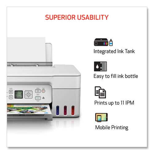 Designed for home and home offices, the Canon PIXMA G3270 MegaTank all-in-one color inkjet printer delivers high-quality, low-cost printing and outstanding wireless connectivity in a compact size. The printer is easy to set up and maintain and offers great media versatility to print on a variety of media types and sizes, including photo paper, envelopes, banners and more. Print both documents and photos on a variety of paper types using a hybrid ink system with pigment black for sharp black text and dye-based colors for vivid borderless photos up to 8.5" x 11". Produce crisp, colorful documents quickly and cost-effectively with fast print speeds and a high-quality four-color pigment-based ink system. Keep printing with a plain paper capacity of up to 100 sheets or 20 photo sheets (4" x 6"). Easily connect and print through high-speed USB or wirelessly from computers or mobile devices.Package Includes: Set of Ink Bottles (GI-21: PGBK, C, M, Y); Print Heads; Documentation; Power Cord