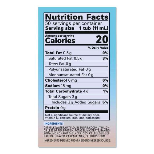 Stir up the perfect cup with Coffee mate, America's #1 creamer brand. Nestle Coffee mate Oat Milk flavored liquid creamer singles are a plant-based, non-dairy way to add rich, velvety flavor and a hint of sweet, vanilla natural flavor to your cup of coffee. It is shelf stable with no refrigeration needed. Coffee mate Oat Milk flavored liquid creamer singles retain their delicious flavor at room temperature for up to nine months unopened. Find your perfect match with NESCAFE Coffee and Coffee mate Oat Milk flavored liquid creamer singles. All Coffee mate foodservice single serve creamers are cholesterol-free, gluten free and kosher dairy. See the full Coffee mate ingredients statement for Coffee mate creamer ingredients.Note: This is a non-returnable item.