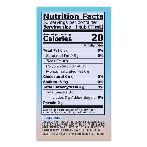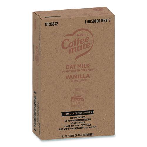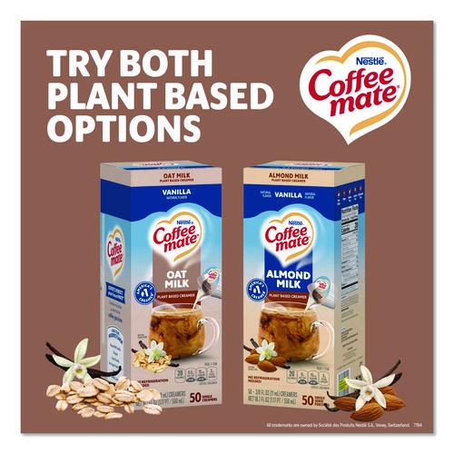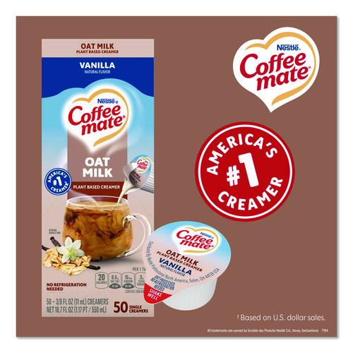 Stir up the perfect cup with Coffee mate, America's #1 creamer brand. Nestle Coffee mate Oat Milk flavored liquid creamer singles are a plant-based, non-dairy way to add rich, velvety flavor and a hint of sweet, vanilla natural flavor to your cup of coffee. It is shelf stable with no refrigeration needed. Coffee mate Oat Milk flavored liquid creamer singles retain their delicious flavor at room temperature for up to nine months unopened. Find your perfect match with NESCAFE Coffee and Coffee mate Oat Milk flavored liquid creamer singles. All Coffee mate foodservice single serve creamers are cholesterol-free, gluten free and kosher dairy. See the full Coffee mate ingredients statement for Coffee mate creamer ingredients.Note: This is a non-returnable item.