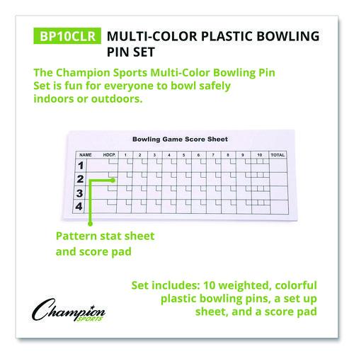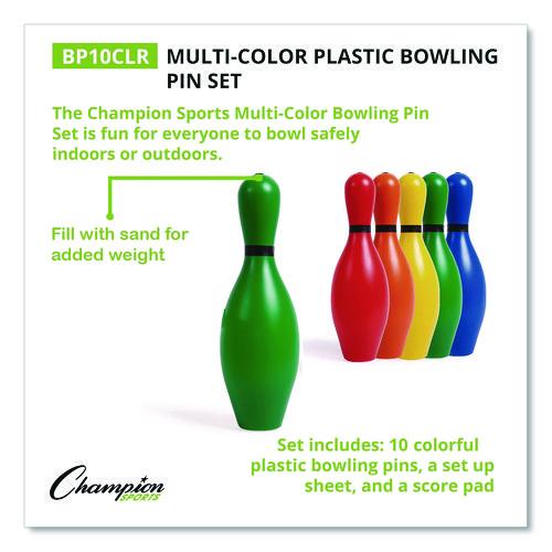 The Champion Sports Bowling Pin Set is fun for everyone to bowl safely indoors or outdoors. Don’t worry about the wind or slightly uneven surfaces ruining your game ideas, each pin has a 0.5” capped hole to add sand for additional weight and stability so pins stay in place, and you can bowl over and over. This set includes ten plastic bowling pins, a setup sheet, and a score pad.Package Includes: (10) Bowling Pins; Score Pad; Set-Up SheetNote: This is a non-returnable item.