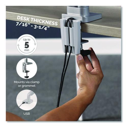 Two fully independent adjustable monitor arms with innovative gas spring technology allows for effortless monitor adjustment. Intuitive cord management system helps minimize clutter. Two 3.0 USB ports located at the base of the product make it easy to connect to your favorite devices. Easy to mount can be mounted via clamp on desks between 0.8" and 4.7" thick or grommet hole between 0.3" and 2.9". Each arm holds a monitor up to 17.6 lbs.