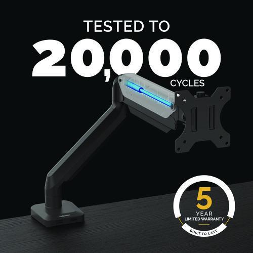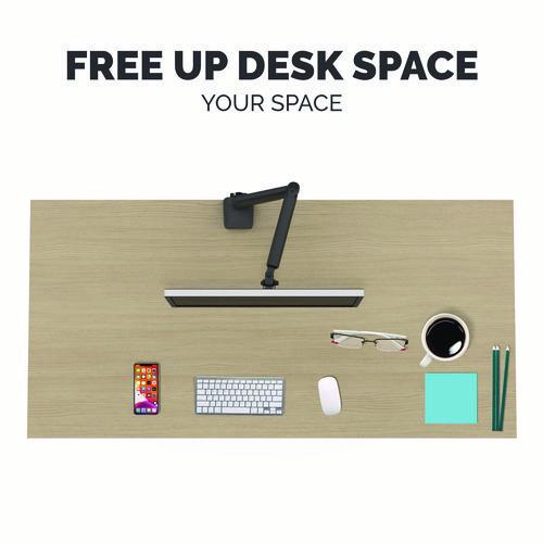 Increase valuable desk space and easily adjust your monitor to reduce eye, neck and shoulder strain. Easily connect your favorite devices with 2 USB ports conveniently located at the base of the product. Easy and effortless monitor adjustment with innovative gas spring technology. Adjustable arm easily lifts monitor up and down through a 15" height range. Easy to mount via clamp or grommet. Minimize clutter with the intuitive cord management system.