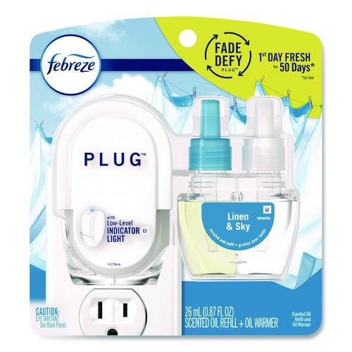 Ready to hit refresh and be an A+ odor fighter? Just refill the Febreze Fade Defy PLUG and plug it into any outlet (they'll even rotate if your outlet is upside down) in any high-traffic area of your home the kitchen, bathroom, or anywhere else odors like to linger.Package Includes: (1) Warmer; (1) Linen & Sky Scent Refill