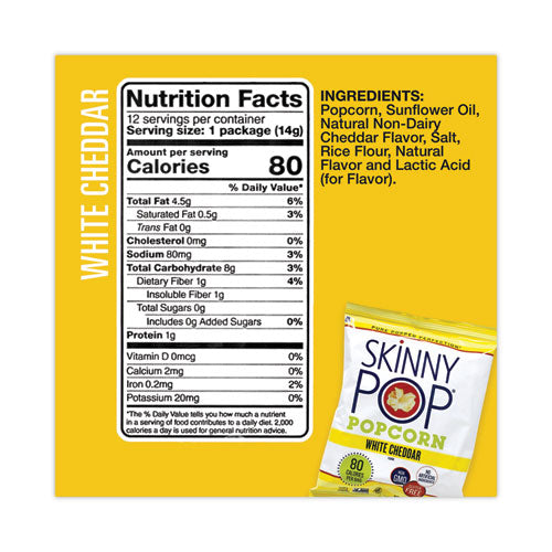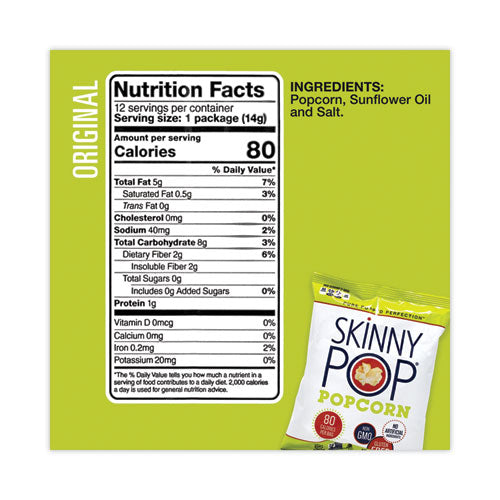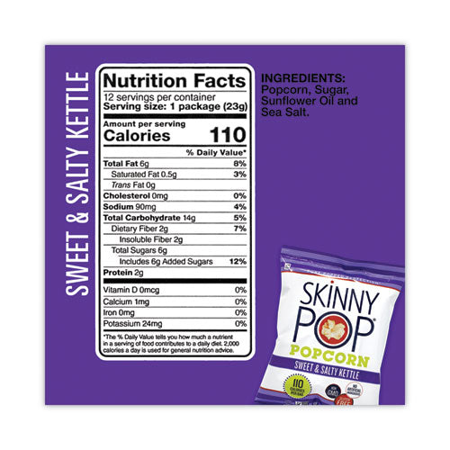 Enjoy the pure popped perfection of SkinnyPop's popcorn variety pack. They are made with 100% premium popcorn, pure sunflower oil and a touch of salt. Pack in school or work lunches, grab for a snack on the go, or just relax with the delicious crunch of a snack you won't feel guilty about eating. SkinnyPop also contains no GMO's, preservatives or artificial ingredients, so you can satisfy your late-night salty cravings guilt-free.Note: This is a non-returnable item.