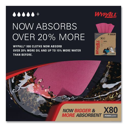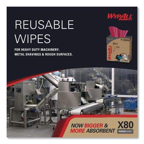 WypAll® is the number one brand of disposable wipes in the US and Canada. Maximize performance while minimizing time, effort and product waste. If you've been using industrial cloth towels, it's time to make the switch to WypAll® PowerClean™ X80 Cloths. These cloths feature innovations like high-tech Hydroknit® fast-absorbing material and are durable for scrubbing. WypAll® X80 cloths now absorb over 20% more oil and up to 15% more water than before. In addition, they now feature a tough, precision-engineered surface texture, making them even more effective for your cleaning tasks. The heavy-duty cloths are made of soft pulp fibers, bonded to a polypropylene base sheet for absorbency and durability, making them suitable for removing dirt, oil, grime and solvents in industrial and manufacturing businesses. The cloths are reusable and reinforced for strength when wet and dry. These bulk cloths are a great alternative – safer and more efficient – to replace laundered rental shop towels and cleaning towels. These premium industrial cleaning cloths can be used for heavy-duty machine and part wiping, wiping metal shavings, prepping surfaces with solvents, and cleaning rough surfaces. When you're running a business, it pays to use the very best supplies. For the toughest grease and grime, trust the performance and innovation of WypAll® PowerClean™ X80 Heavy Duty Cloths.