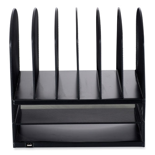 This organizer features a USB port to easily charge your electronics. Durable, designed with steel mesh construction. A versatile filing center that is designed with two horizontal trays for letter-size documents and six large-capacity vertical sections for file folders and binders. Includes USB cord and power cord to plug into wall.Note: This is a non-returnable item.