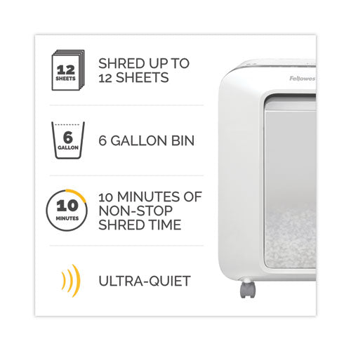 The LX200 features a patented 100% Jam Proof™ System that automatically detects and powers through jams so you don't have to. Shred up to 12 sheets per pass into small micro-cut particles (5/32" x 1/2"; Security Level P-4) for enhanced protection. Includes SafeSense® Technology, which automatically monitors and immediately stops shredding when hands or pets are too close. The LX20 shreds continuous for up to 10 minutes so personal shred jobs can be completed in one sitting. SilentShred™ offers ultra-quiet performance for shared workspaces. The six-gallon pull-out waste bin keeps shredded particles contained so workspaces remain clean.