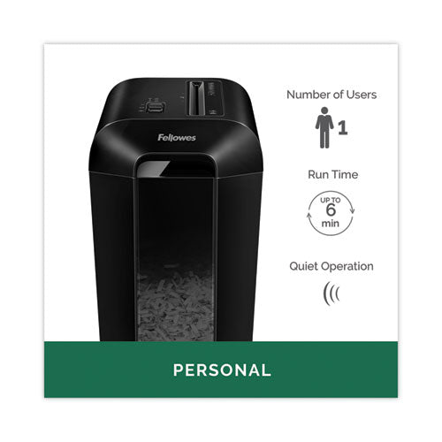 The Powershred® LX65 Cross-Cut Shredder is a reliable desk side shredder for personal use. It's elevated and sophisticated design brings distinction to any work or home office environment. The patented SafeSense Technology feature automatically stops the machine from shredding if hands or paws touch the paper entry, providing superior protection and peace of mind. The LX65 shreds 10 sheets per pass into 5 /32" x 1 9/16" cross-cut particles (Security Level P-4) and safely shreds staples, paper clips, and plastic credit cards. Its 6 gallon waste bin with easy lift-off head holds over 300 shredded sheets. Designed for individual use, the LX65 shreds for up to 6 minutes before a 20 minute cool down period is needed.