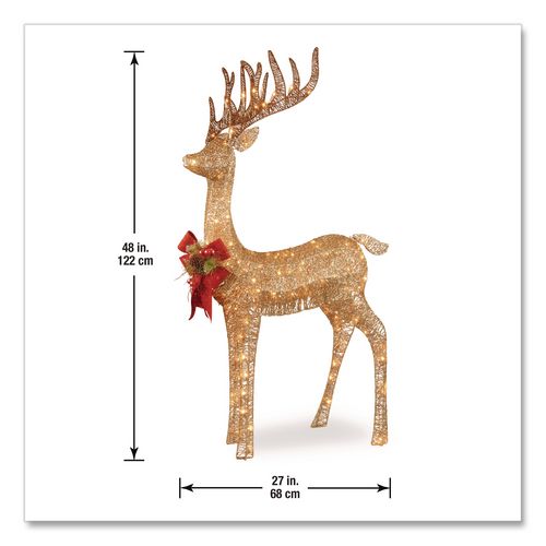This Reindeer is made with a glittered sisal material that is attractive, strong and durable. The champagne color of the reindeer adds a touch of sophistication and glamour to your decor. It is lit with 105 warm white LED lights that sparkle and shine. This seasonal trimming features a bright red bow with bristle, pinecones and berries. For indoor or outdoor display.Note: This is a non-returnable item.