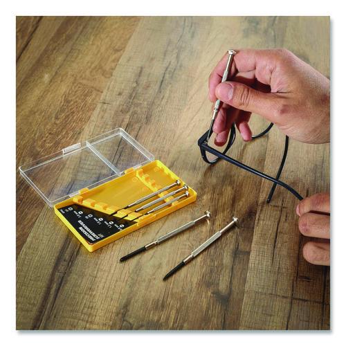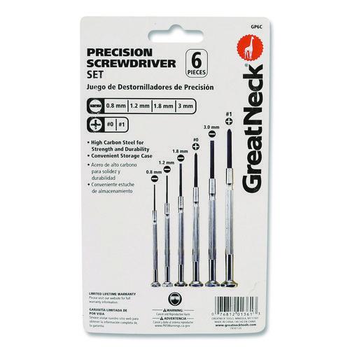 The Great Neck® Precision Screwdriver Set is ideal for detailed work. Featuring heat-treated and tempered, high-carbon steel tips and shanks as well as ribbed, polished steel handles, these screwdrivers are meant to withstand the rigors of repeated use. Use them for electronics work, eyeglass repair, musical instrument adjustments and more. To ensure neat and easy storage and convenient carrying, the included storage case provides a labeled, snap-in slot for each precision screwdriver in the set.