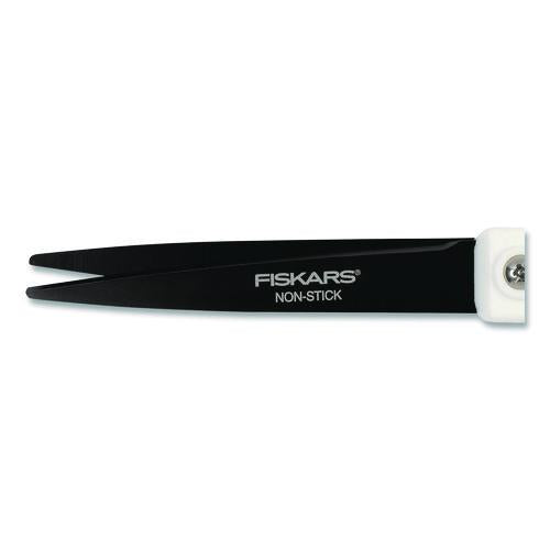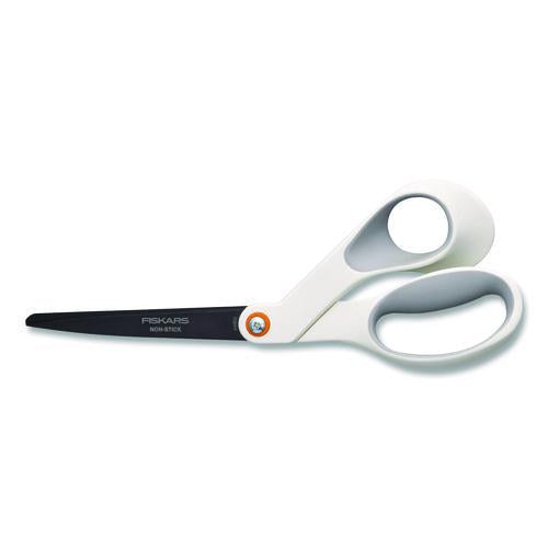 Fiskars® Premier SoftGrip Nonstick 8" Scissors are ideal for cutting a wide variety of materials including denim, silk and multiple layers of fabric. They feature a non-stick blade coating that makes it easy to cut cleanly through materials with sticky adhesives like tape or glue. The high-grade, precision-ground, stainless-steel blades offer a lasting sharp edge that cuts all the way to the tip. The ergonomic handle is sculpted to fit your hand, maximizing cutting control and sensitivity, while a bent handle design keeps material flat for mistake-free cutting.