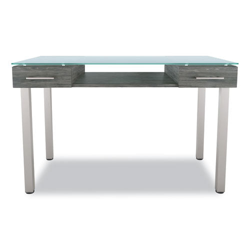 Combine sophistication and functionality when you add this desk to your office. Gleaming glass desktop delivers a modern look and a smooth writing surface. Two letter-size drawers provide discreet storage for office supplies and paperwork. Open design underneath provides space for additional desk components to create a custom setup. Features metal legs for added strength and stability.