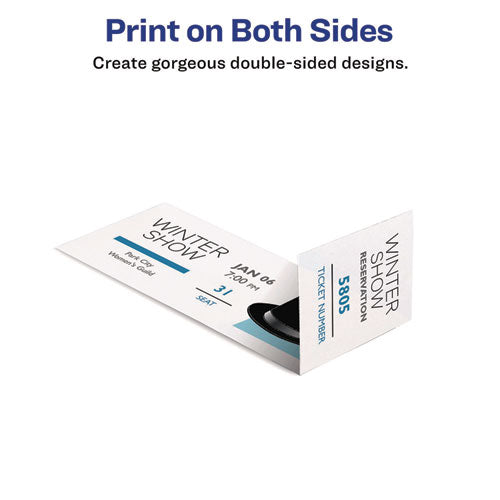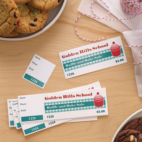 Create a buzz for your event or fundraiser by designing professional looking tickets from your own computer. These customizable Tickets with Tear-Away Stubs are easy to print and offer a professional look, making them perfect for raffles, door prizes, dances, school and church events or fundraisers. You can personalize your tickets on one or both sides at Avery® Design & Print with complimentary designs and templates, which include automatic ticket numbering options for easy record keeping. The tickets separate cleanly after printing with no scissors required. Strong perforations on the stubs ensure they will stay put until your event. Now you can create personalized tickets that will be the talk of any event. For laser and inkjet printers. Ten tickets per sheet. Card size is 1.75" x 5.5".
