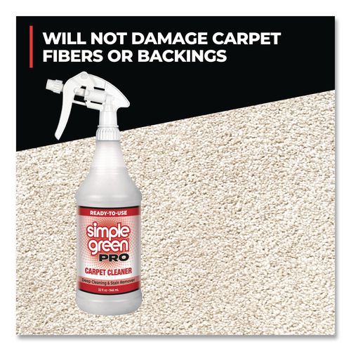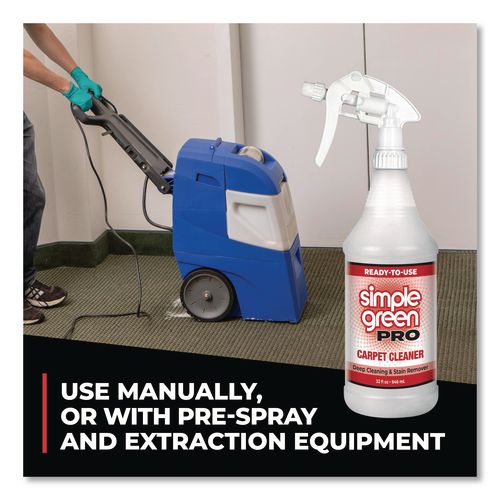 Simple Green PRO Carpet Cleaner removes dirt, oil, food spills, and stains from carpets, rugs, fabric, and upholstery. Will not damage carpet fibers or backings. Ready-to-use formula can be used straight from the bottle. Cleans and deodorizes without harmful amines or bleach that can cause damage and discoloration. Use manually or with pre-spray and extraction equipment. Strong enough to deep clean high-traffic areas, but gentle enough for everyday use.